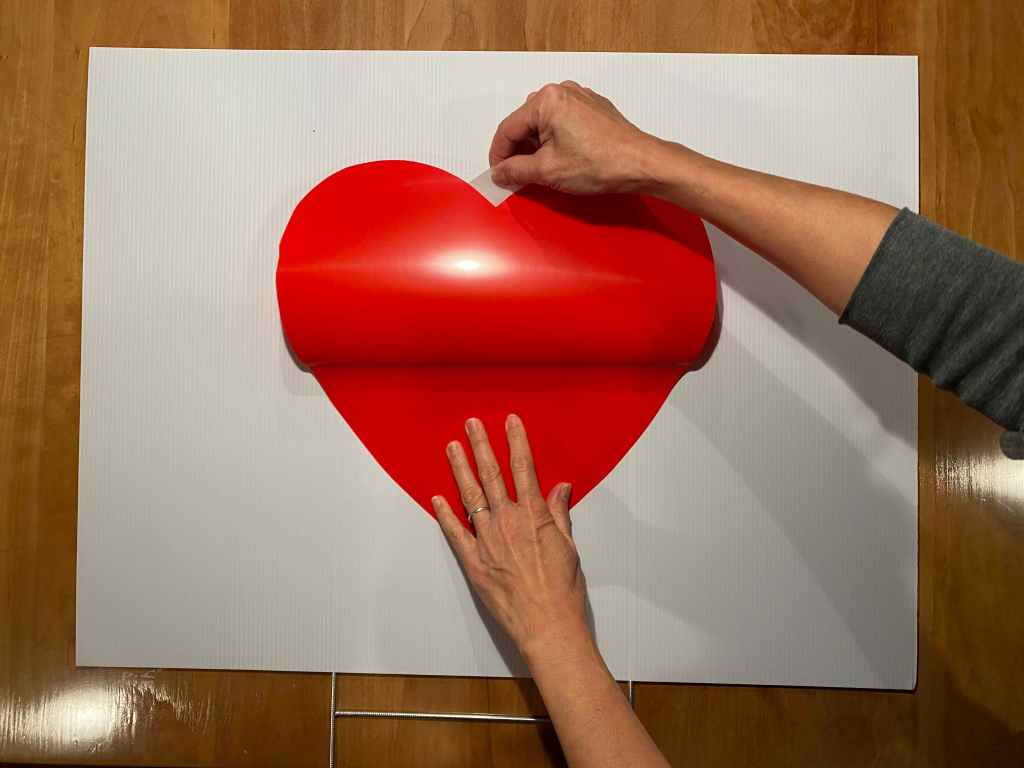 This next step is best done with two people. Begin by starting to peel a small amount of the backing paper from the bottom point of a red heart. Do not remove the entire backing at one time. While one person positions the adhesive point of the heart in place and gently smooths out the vinyl with both hands, the other person can slowly peel the paper from the vinyl.